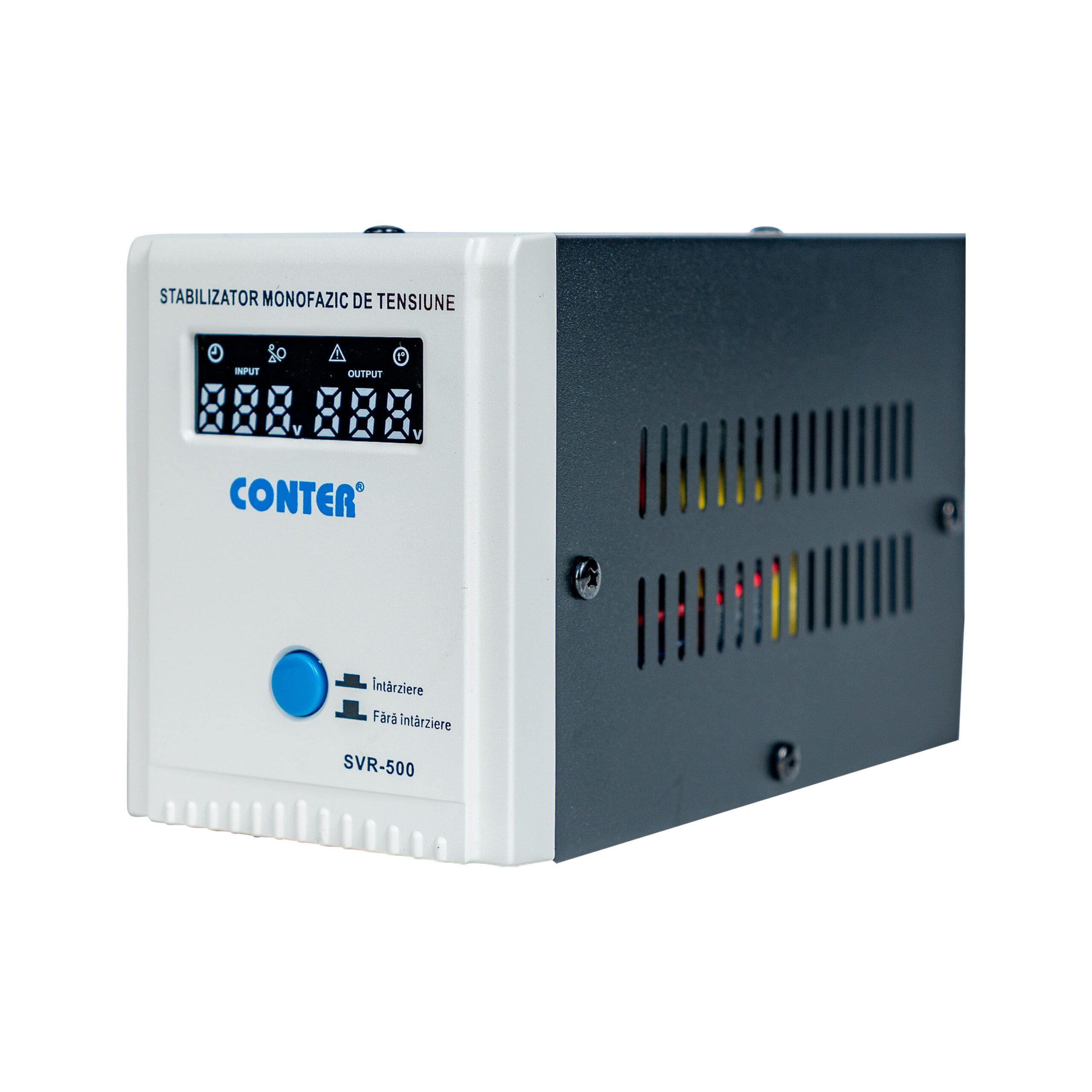 Stabilizator monofazic de tensiune cu releu Conter SVR-500 – proiectat pentru a regla și stabiliza tensiunea de intrare provenită din rețeaua electrică, asigurând un nivel constant al acesteia la ieșire. Această caracteristică protejează dispozitivele electrice și electronice conectate împotriva variațiilor bruște de tensiune, care pot cauza deteriorări sau disfuncționalități.