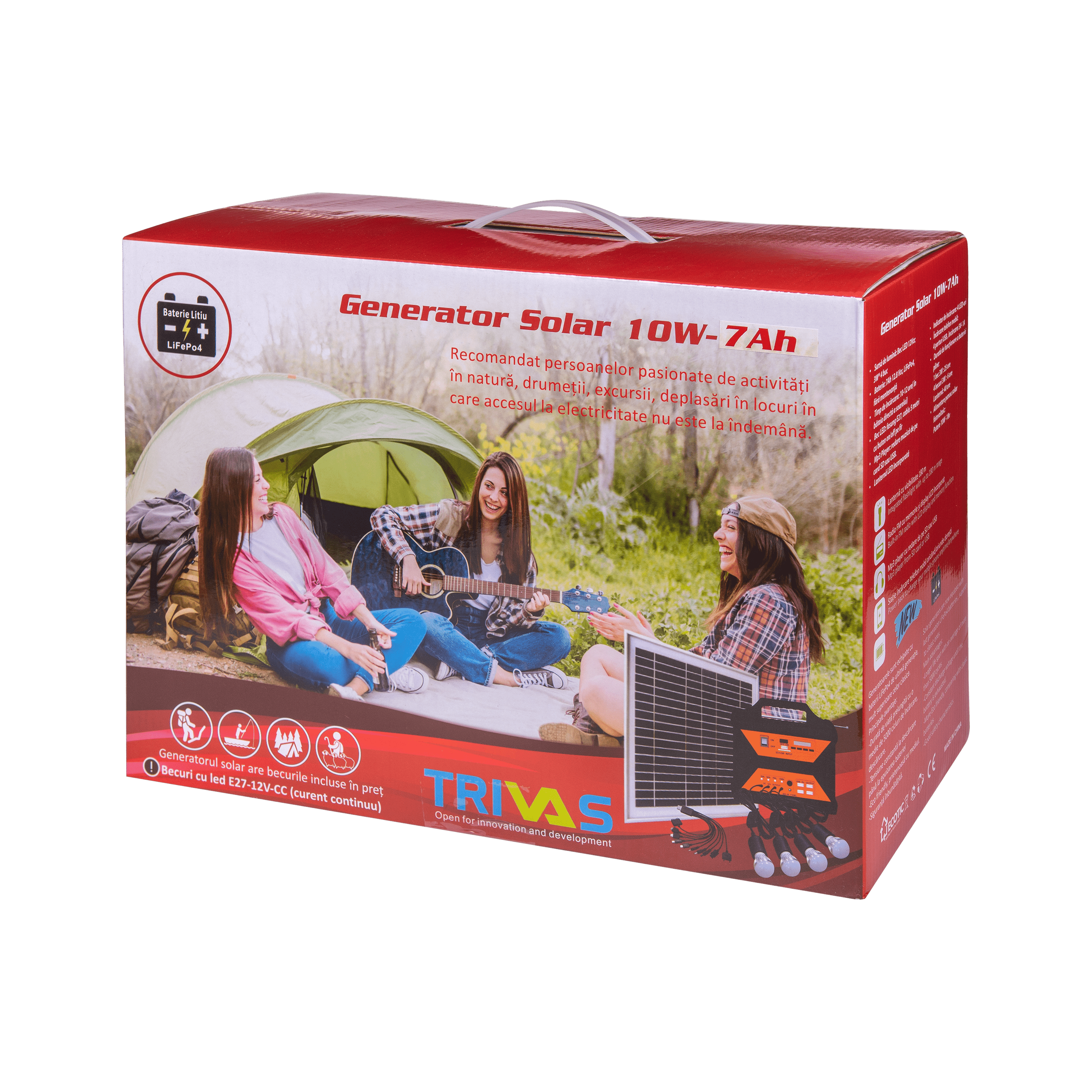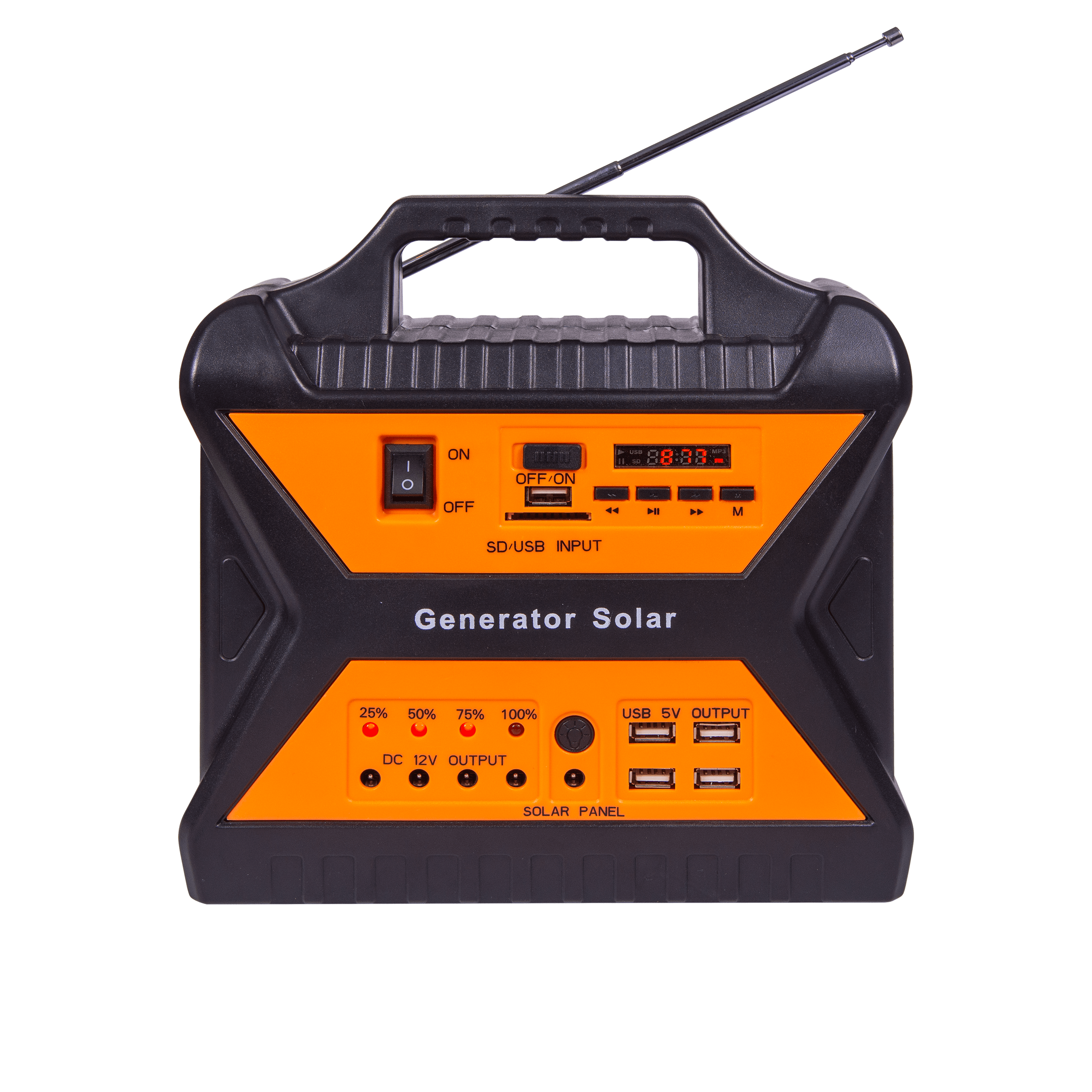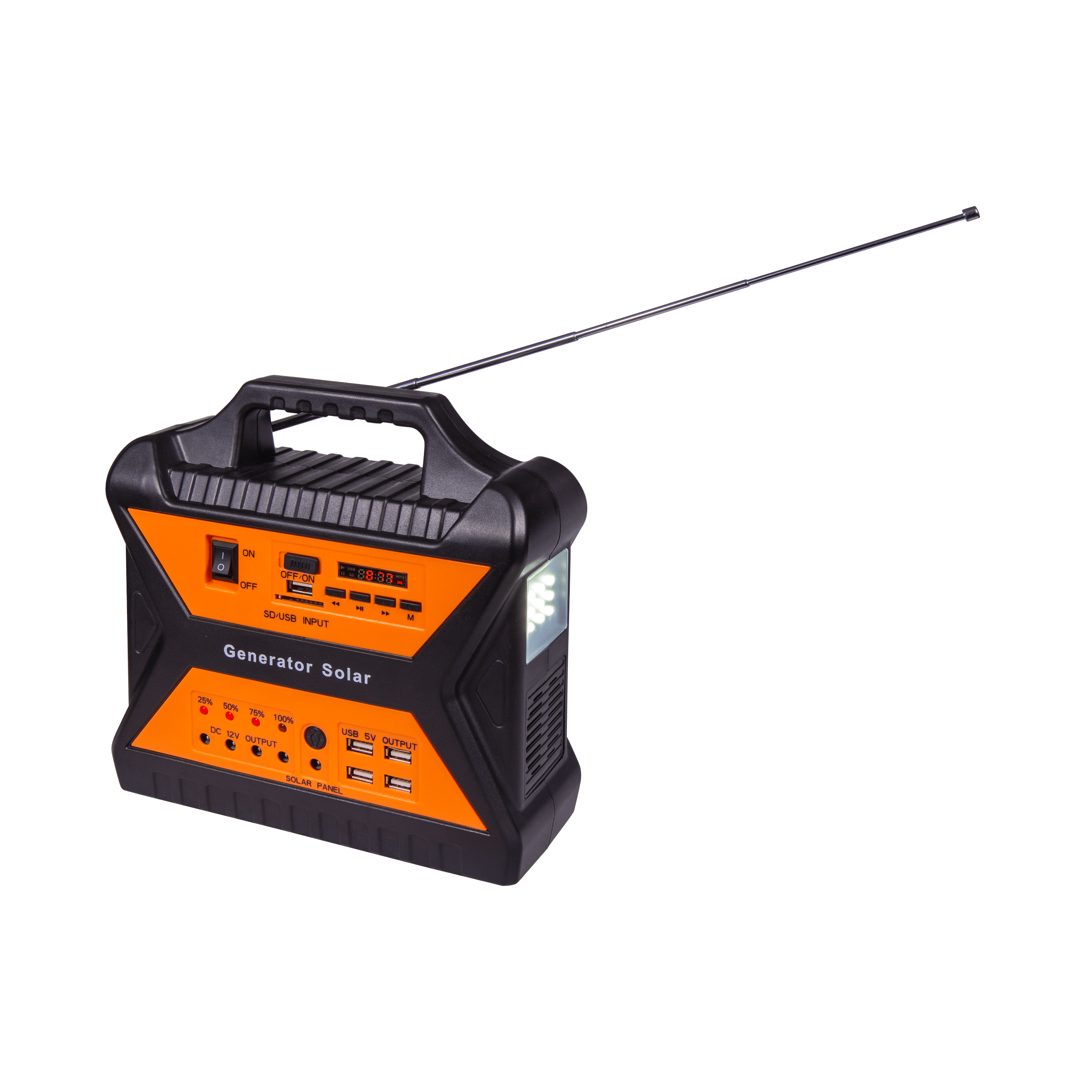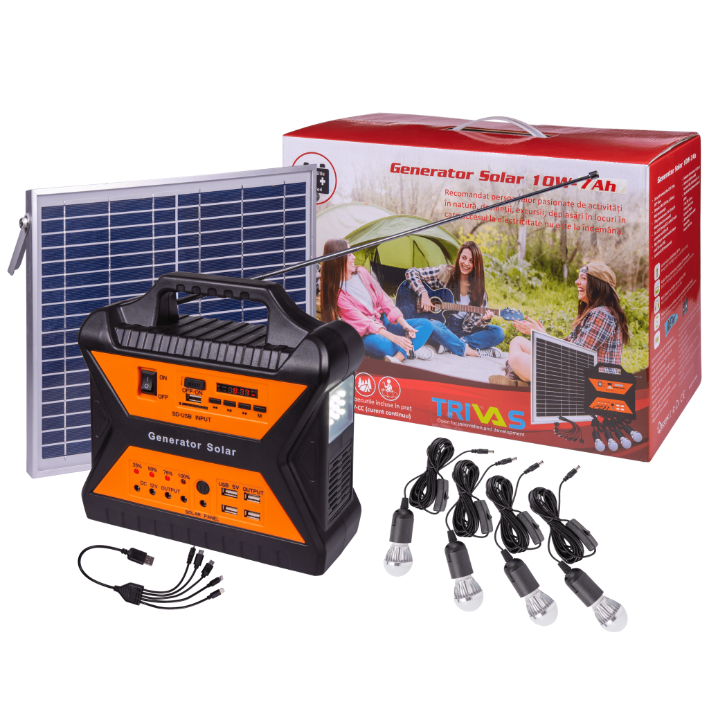 Generatorul solar detine o baterie 7AH 12V si 4 becuri LED cu alimentare la 12V. Acesta permite incarcarea telefonului mobil (port USB – 4 porturi 5v 1000mAh) si redarea muzicii de la SD, USB + radio FM / AM. De asemenea, detine un indicator de incarcare cu 4 LED-uri si o lanterna LED incorporata. Dimensiunile generatorului solar sunt de: 227x230x90mm.