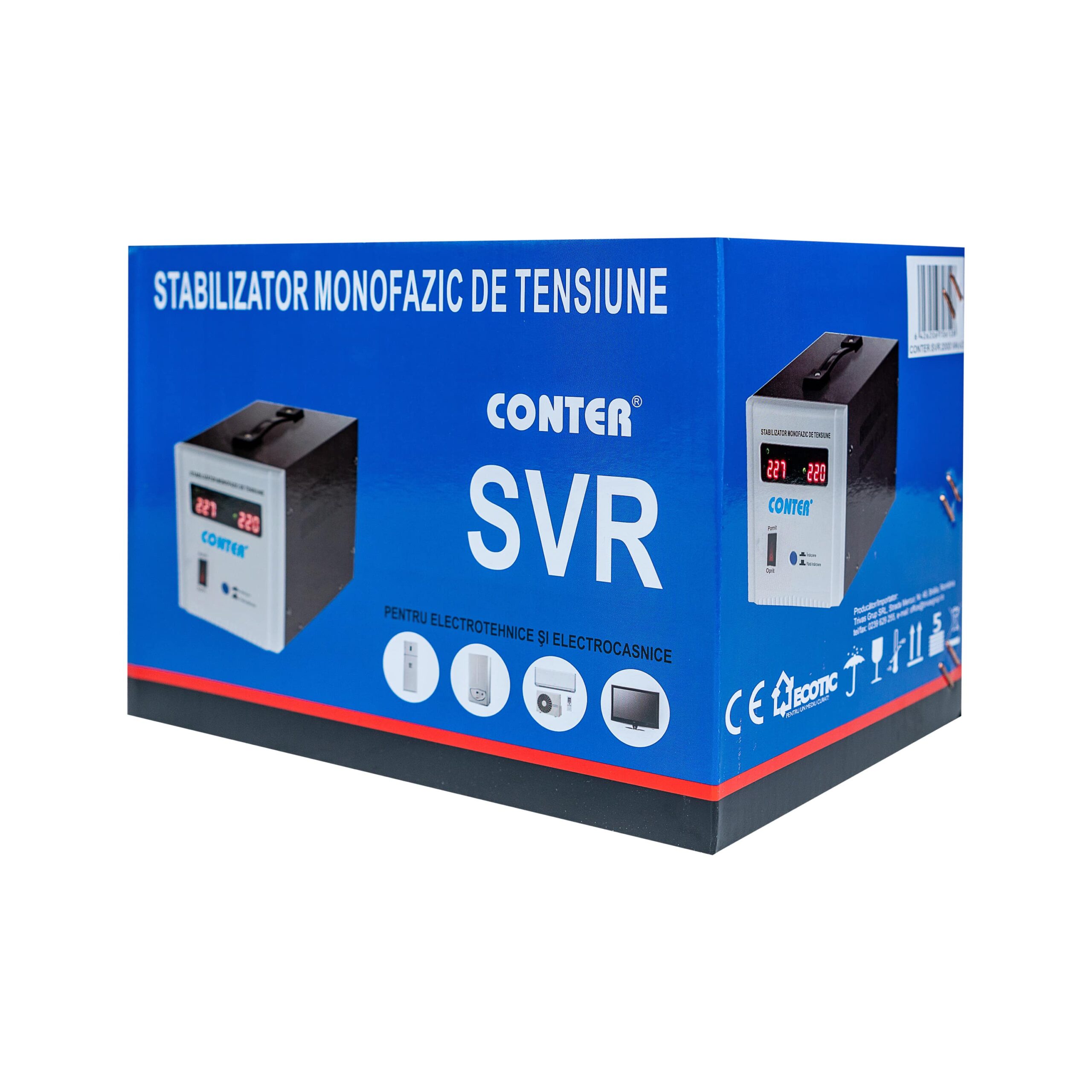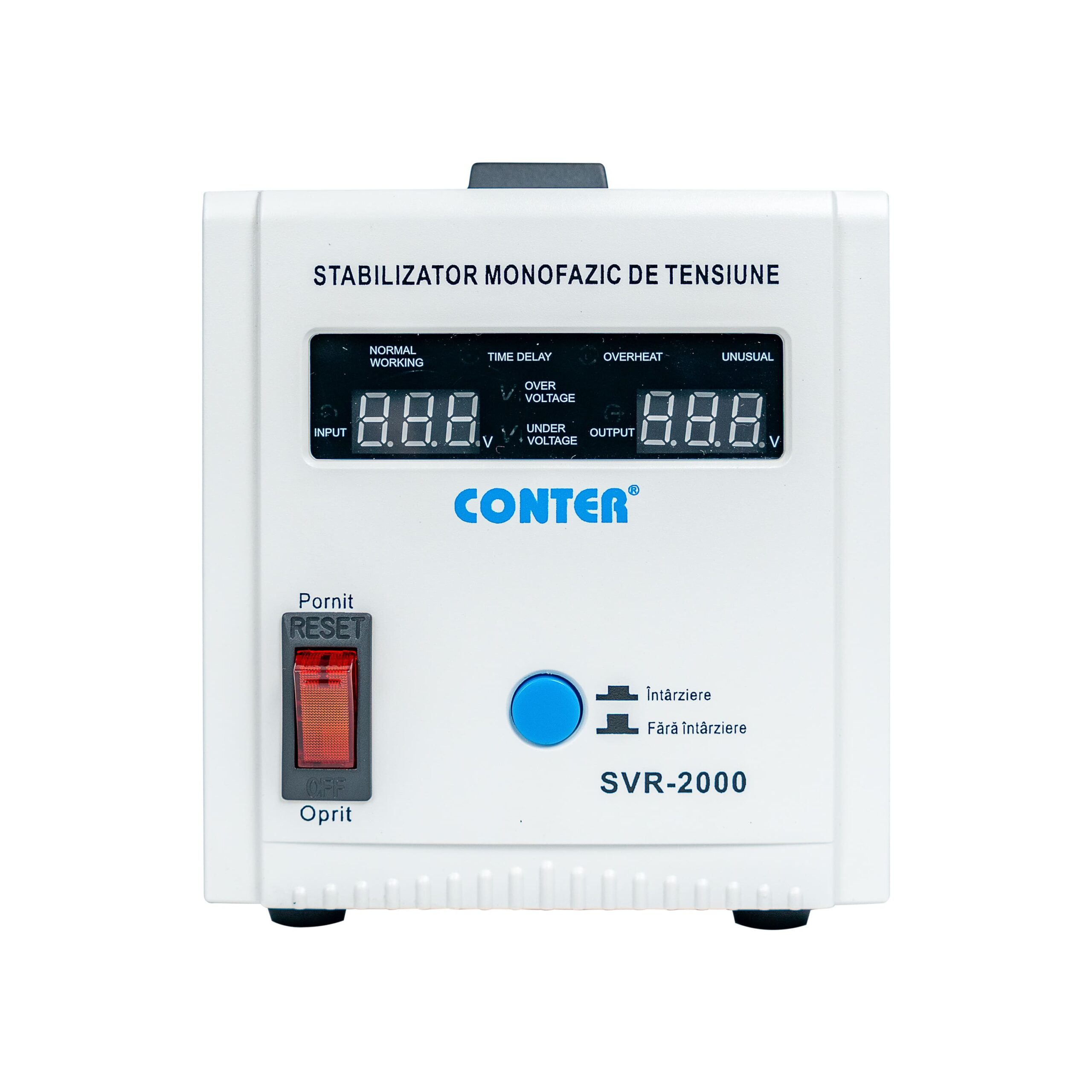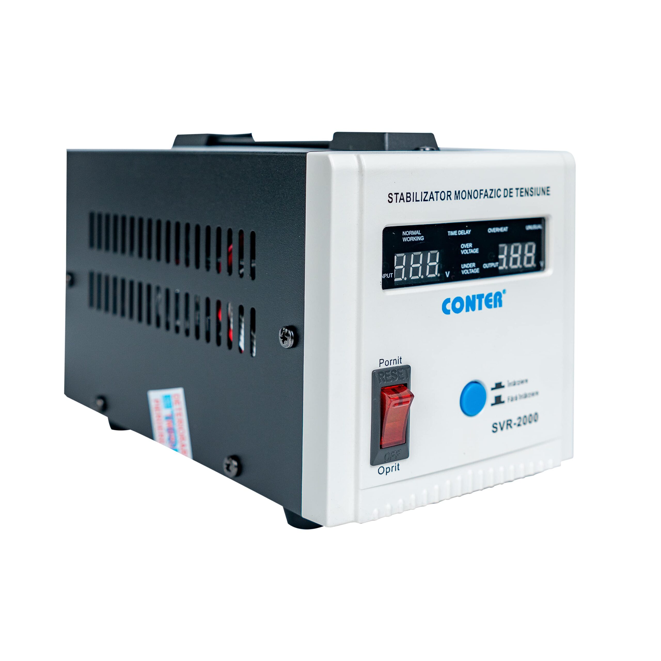 Stabilizator monofazic de tensiune cu releu Conter SVR-2000 – proiectat pentru a regla și stabiliza tensiunea de intrare provenită din rețeaua electrică, asigurând un nivel constant al acesteia la ieșire. Această caracteristică protejează dispozitivele electrice și electronice conectate împotriva variațiilor bruște de tensiune, care pot cauza deteriorări sau disfuncționalități.