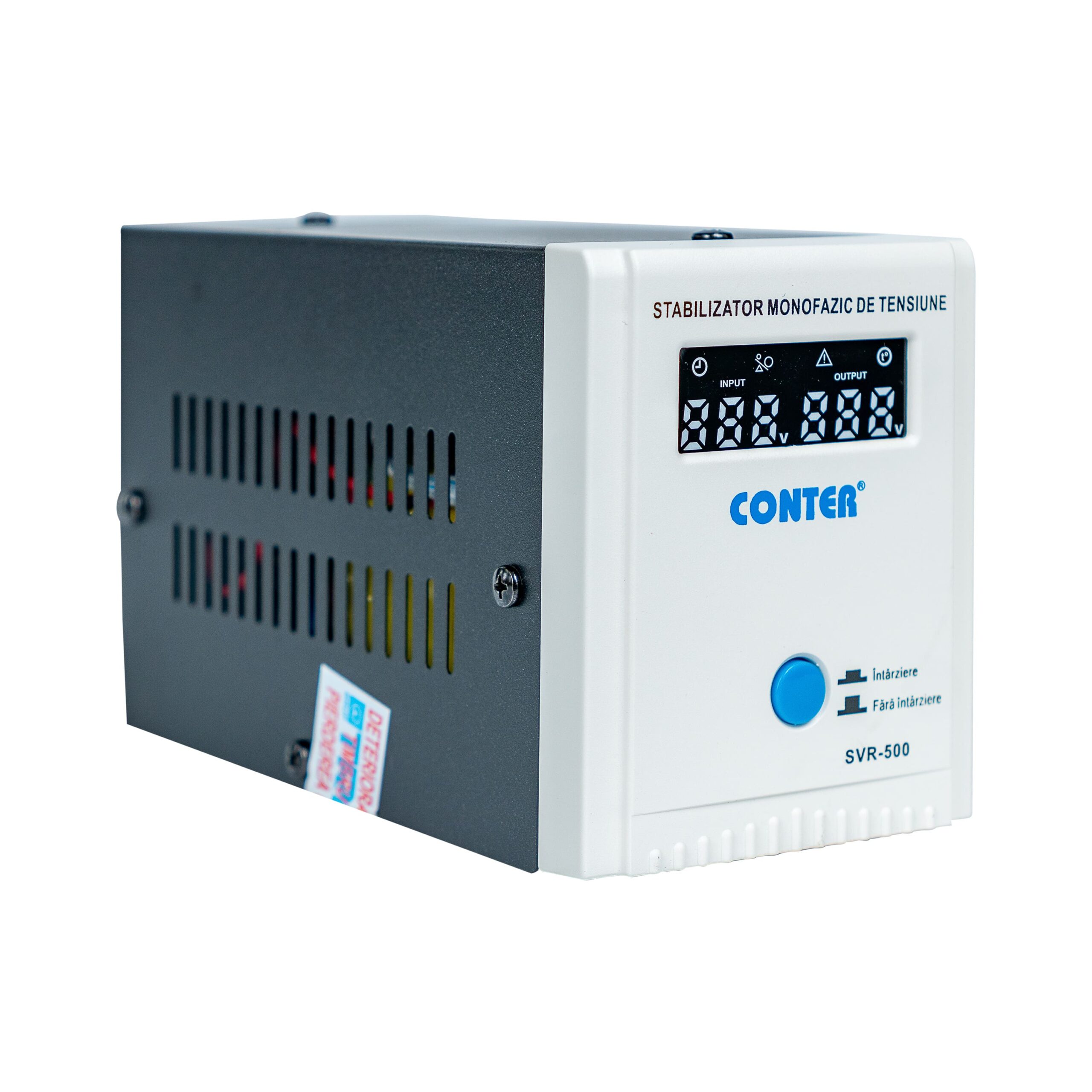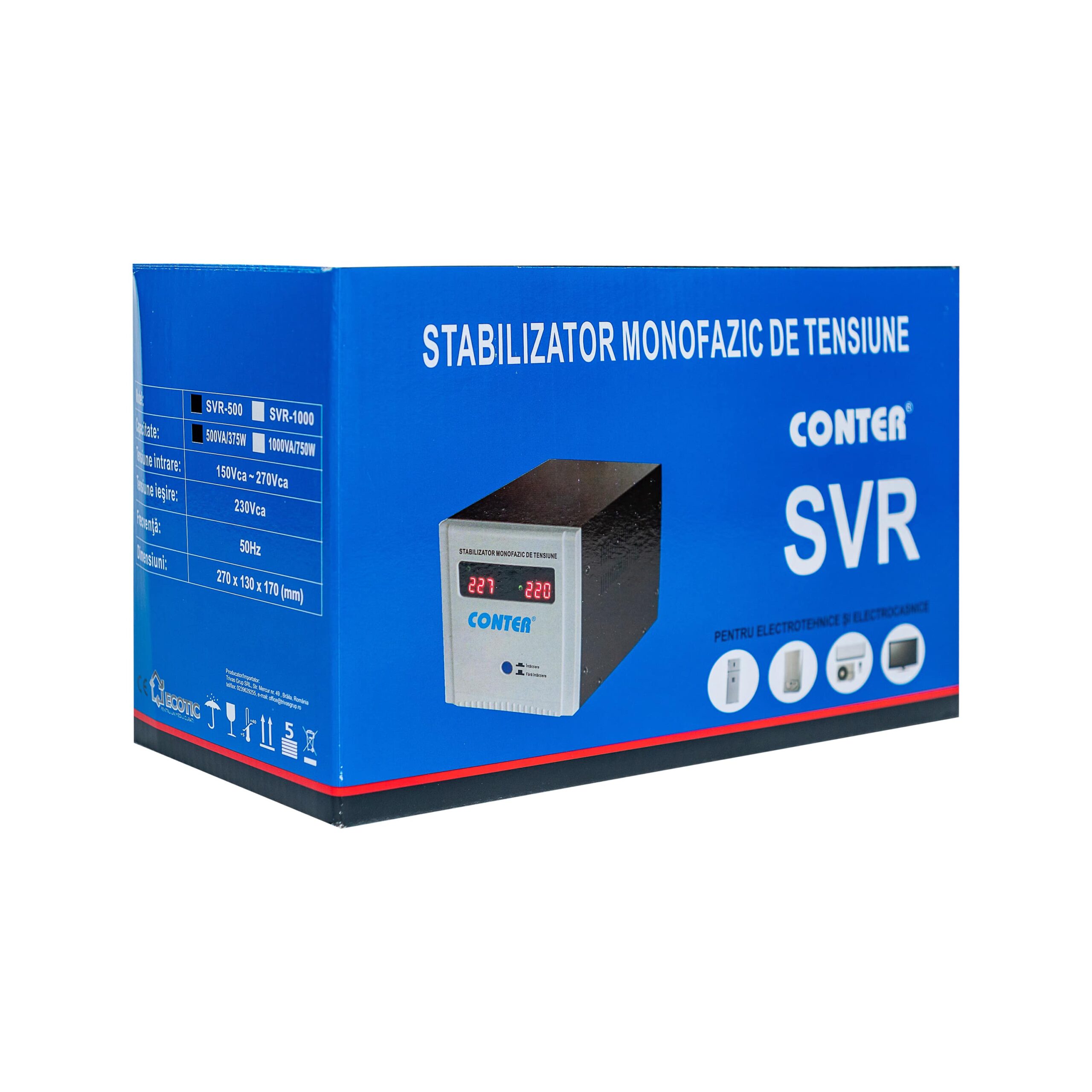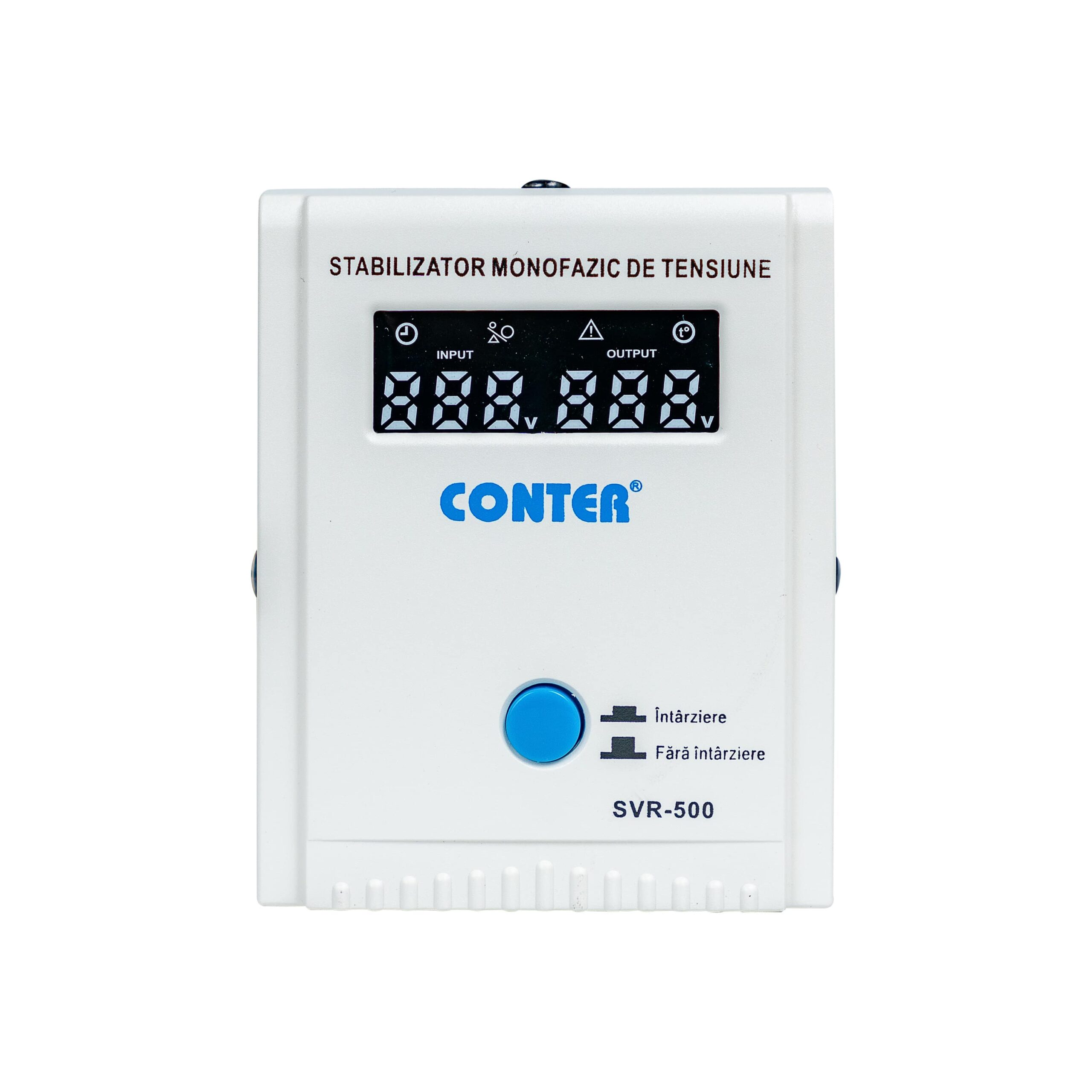 Stabilizator monofazic de tensiune cu releu Conter SVR-500 – proiectat pentru a regla și stabiliza tensiunea de intrare provenită din rețeaua electrică, asigurând un nivel constant al acesteia la ieșire. Această caracteristică protejează dispozitivele electrice și electronice conectate împotriva variațiilor bruște de tensiune, care pot cauza deteriorări sau disfuncționalități.