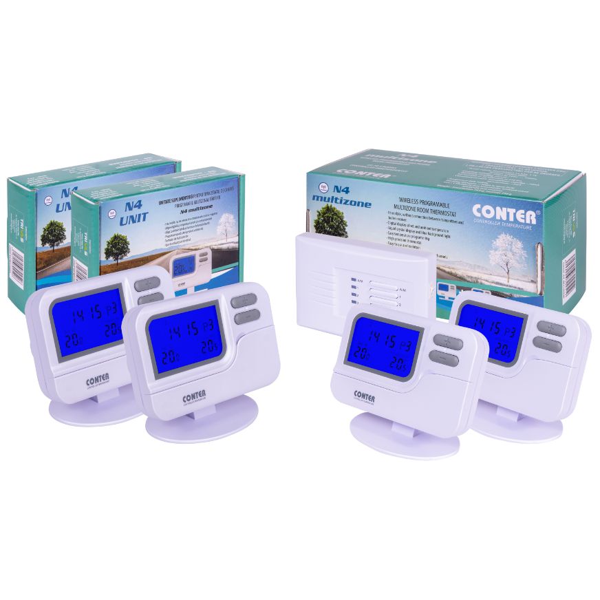 Pachetul standard N4 Multizone, contine un receptor si doua emitatoare (termostate). Daca doriti sa extindeti sistemul pana la maxim 4 emitatoare, acestea se pot achizitiona separat . Termostatul este fara fir (wireless),fiecare unitate fiind programabila individual.
